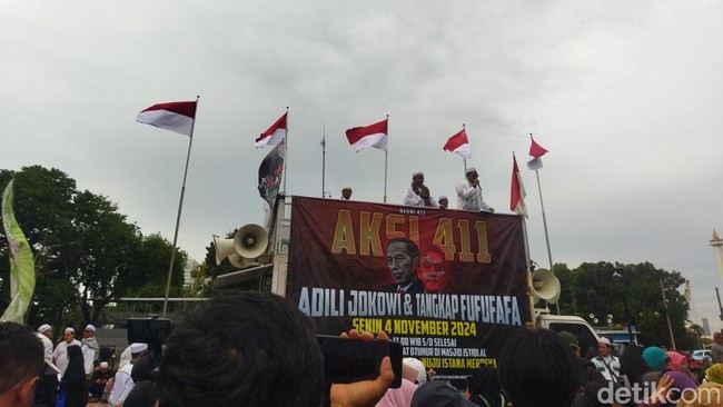 Massa aksi mulai berkumpul di depan Patung Kuda pukul 13.30 WIB. Massa aksi reuni 411 ini tampak mengenakan seragam serba putih. Di mobil komando, terlihat spanduk 'Aksi 411. Adili Jokowi dan Tangkap Fufufafa'.