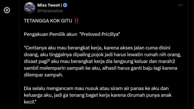 "Ceritanya aku mau berangkat kerja, karena akses jalan cuma di sini doang. Aku tinggalnya di paling pojok, jadi harus lewatin rumah nih orang. Di saat pagi-pagi aku mau berangkat kerja, dia langsung keluar dan marah-marah sambil melemparin sampah ke aku. Alhasil harus ganti baju lagi karena dilempar sampah," tulis netizen yang mengaku korban di media sosial X.