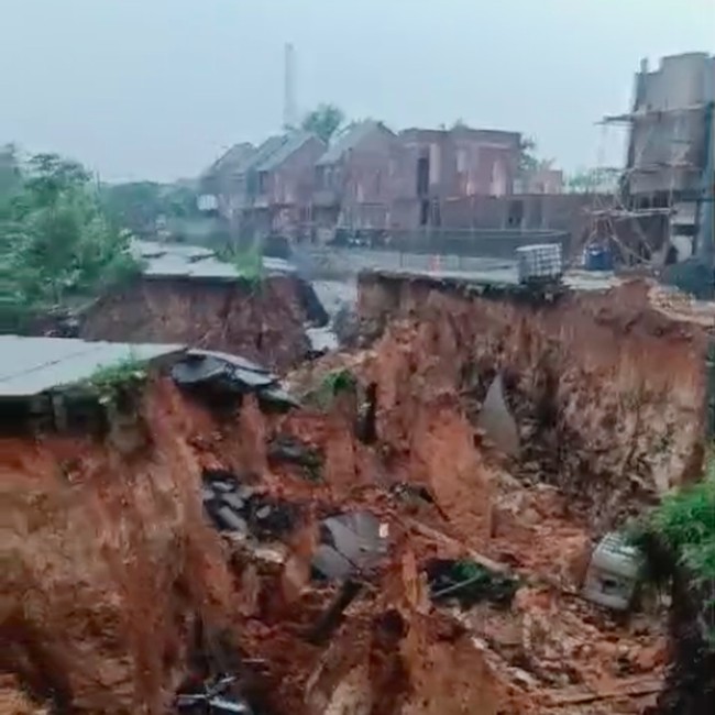 Bencana longsor terjadi di Jalan Rancahaur, Desa Karang Tengah, Kecamatan Pagedangan, Kabupaten Tangerang, Banten. Longsor terjadi karena tingginya intensitas hujan.