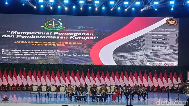 Pantauan detikcom di lokasi, Kamis (7/11/2024), acara Rakornas didahului dengan diskusi oleh sejumlah anggota Kabinet. Di sesi pertama diskusi diisi oleh Menko Polkam Budi Gunawan, Menko Hukum dan HAM, Imigrasi, dan Pemasyarakatan Yusril Ihza Mahendra, hingga Jaksa Agung ST Burhanuddin.