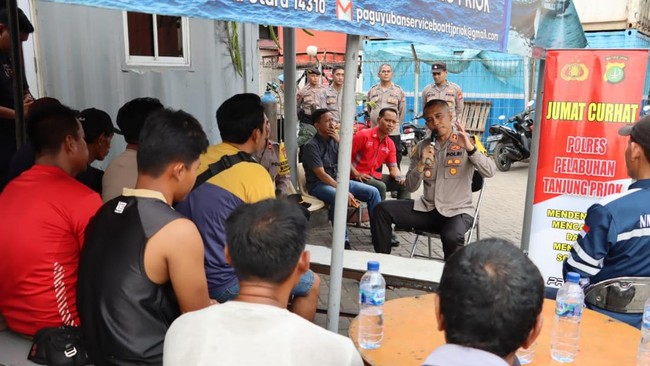Polisi menggelar dialog dengan Paguyuban Service Boat di Dermaga Arsa Pelabuhan Tanjung Priok, Jakarta Utara. Polisi mengimbau para pekerja agar tidak terjerumus dalam lingkaran perjudi online (judol).