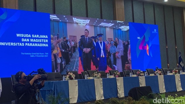 Menko Infrastruktur dan Pembangunan Kewilayahan Agus Harimurti Yudhoyono (AHY) menghadiri acara wisuda sarjana dan magister Universitas Paramadina. Rektor Universitas Paramadina Prof Dr. Didik J. Rachbini menyampaikan terima kasih atas kehadiran AHY.