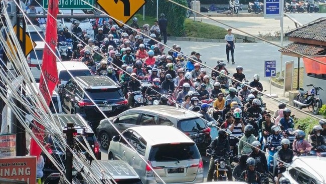 Dalam foto tersebut, terlihat seluruh jalan digunakan oleh kendaraan. Kendaraan roda dua atau sepeda motor terlihat mendominasi jalan.