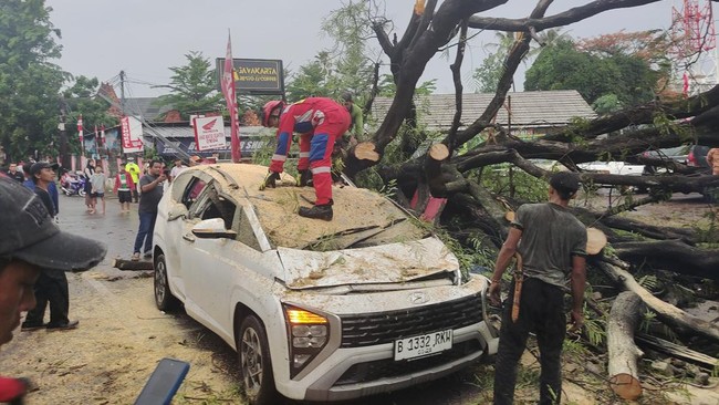 Pohon tumbang menimpa dua unit mobil di Jalan Jambore, Jakarta Timur. Sebanyak lima orang dievakuasi.