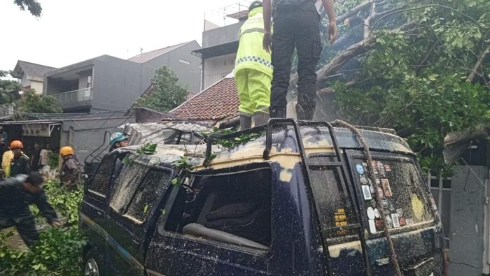 "Pohon tumbang menimpa atap rumah Bapak Made, menimpa warung bakso, menimpa tiga unit mobil, dan menimpa kabel listrik dan PJU (penerangan jalan umum)," jelasnya.