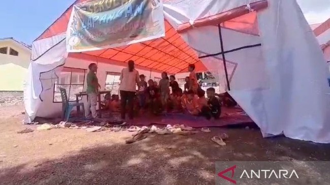 Anak-anak pengungsi erupsi Gunung Lewotobi Laki-laki di Kabupaten Flores Timur, Nusa Tenggara Timur (NTT), mulai mengikuti kegiatan pembelajaran. Sejumlah siswa bersekolah di fasilitas sekolah darurat yang disiapkan di posko pengungsian.