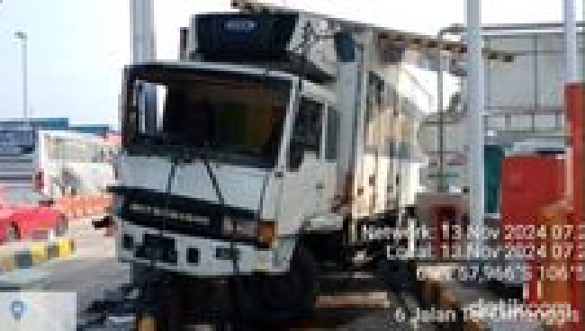 Kecelakaan terjadi sekitar pukul 08.00 WIB tadi. Truk kontainer tersebut menabrak portal gerbang tol untuk kendaraan kecil.