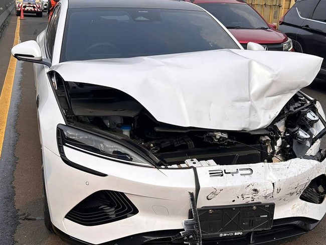 Dari foto yang diperoleh detikcom, terlihat mobil BYD Seal mengalami kerusakan pada bagian depan. Kap mobil sampai menganga dan ringsek.