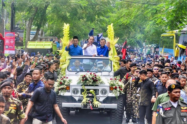 Pantauan detikcom di lapangan, Sabtu (16/11/2024), ketiganya menaiki jeep atap terbuka. Mereka berada di satu mobil yang sama.