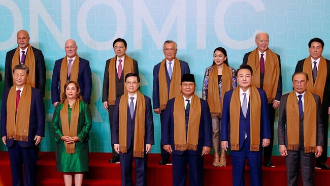 Syal yang sama juga dikenakan para pemimpin dunia lainnya. Syal itu kompak mereka kalungkan. Di belakang mereka terlihat papan besar berlatar biru dengan tulisan 'APEC Economic'.