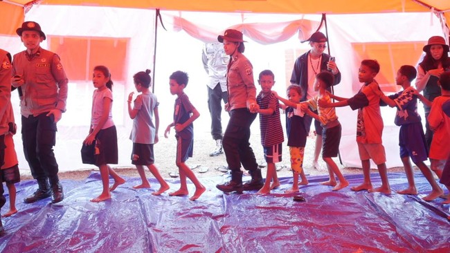 "Dan kegiatan menari yang dirancang untuk mengalihkan perhatian mereka dari pengalaman traumatis serta memulihkan kemampuan dalam menjalin kontak sosial. Tim Psikologi SSDM Polri memberikan energizer kepada kurang lebih 150 anak di setiap posko yang didatangi," ucap Kristiyono.