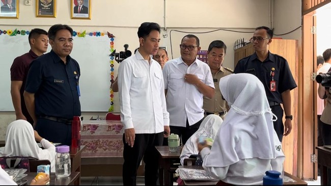 Wakil Presiden Gibran Rakabuming Raka bersama Pj Gubernur DKI Jakarta Teguh Setyabudi meninjau uji coba makan bergizi gratis di SLBN 05 dan SDN 15 Pagi Slipi, Jakarta Barat (Jakbar). Teguh mengatakan Pemprov DKI menyiapkan strategi agar makanan tetap hangat saat diterima pelajar.