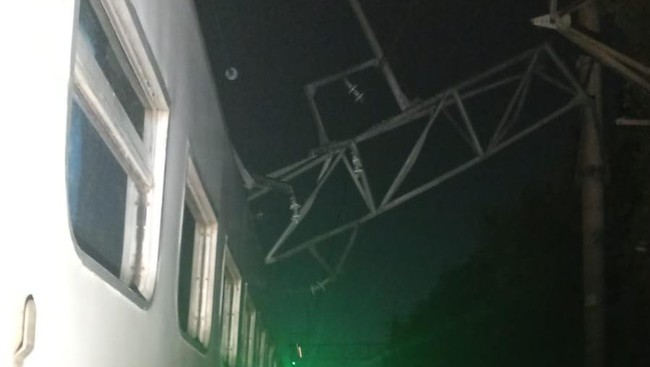 Kereta ApiGumarang tersangkut tiang listrik aliran atas (LAA) di jalur Cakung-Bekasi. KAI melepas 2 gerbong kereta dan penumpang dipindahkan.