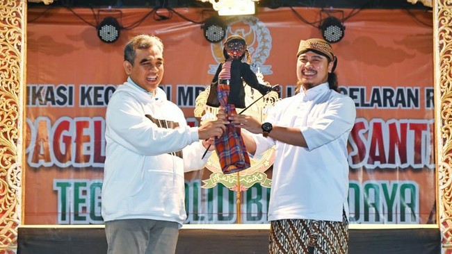 Muzani turut menyerahkan wayang lakon kepada dalang Ki Haryo Entus Susmono di Lapangan Desa Setu, Kecamatan Tarub, Kabupaten Tegal, Selasa (19/11) malam. Wayang Santri dipilih sebagai pengisi acara pagelaran rakyat, karena budaya lokal asli dari tegal.