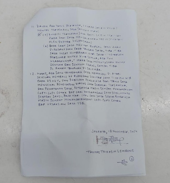 Dalam berkas itu, Tom menuliskan kronologi pemeriksaan hingga penahanannya di Rutan Salemba cabang Kejaksaan Negeri Jakarta Selatan. Ada tiga halaman yang ditulis oleh Tom pada, Senin, 18 November 2024.