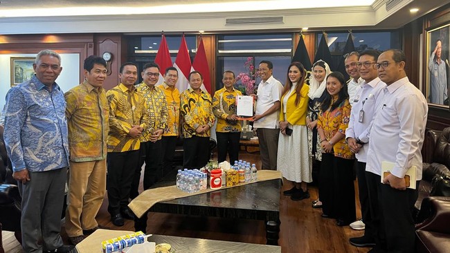 "Ya alhamdulillah hari ini kami didampingi oleh Sekjen, Wakil Ketua Umum, sama Bendahara dapat menghadap Pak Menkum di kementerian ini untuk menerima SK kami yang baru," kata Bahlil.