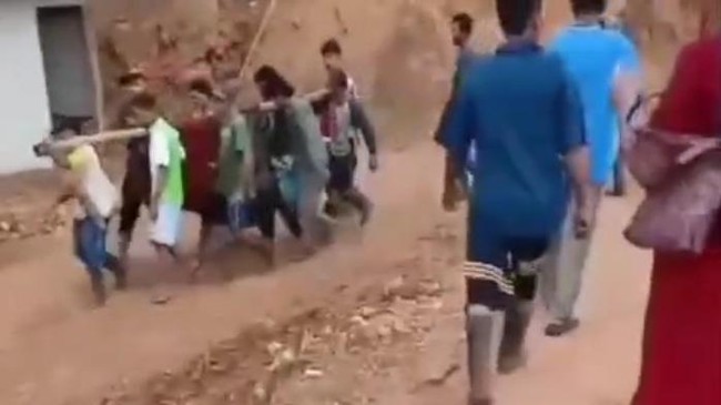 Dalam video berdurasi 1 menit 57 detik yang dilihat detikcom, Jumat (22/11/2024), tampak sejumlah warga menandu seorang wanita dengan menggunakan sarung. Jalanan di lokasi tampak masih berupa tanah.