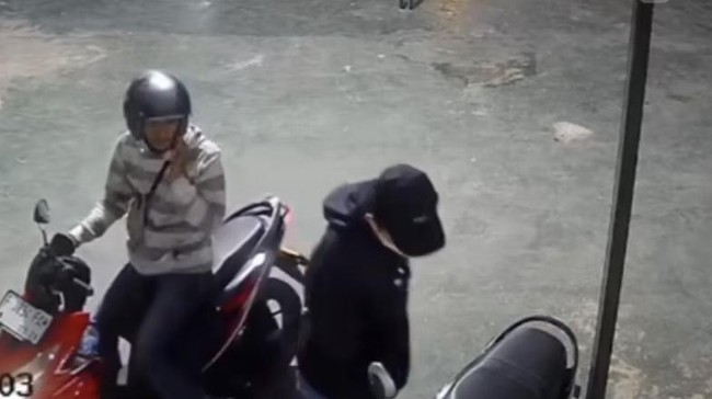 Pelaku pertama mengenakan jaket salur berwarna putih dan cokelat serta mengenakan helm. Pelaku kedua mengenakan jaket hitam dan topi. Pelaku kedua terlihat berusaha membobol kontak motor.