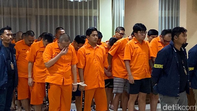 Pantauan detikcom, para tersangka dihadirkan langsung dalam jumpa pers di Balai Pertemuan Polda Metro Jaya (BPMJ), Jakarta Selatan, Senin (25/11/2024). Para tersangka kini mengenakan baju tahanan berwarna oranye dengan tangan yang terborgol.