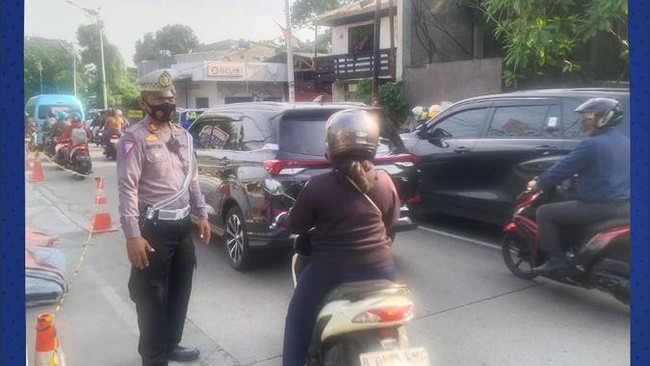 Berdasarkan foto yang diunggah TMC Polda Metro, terlihat petugas telah berada di lokasi untuk mengatur lalu lintas. Jalan yang sedang diperbaiki tersebut ditutup dengan cone pembatas jalan.