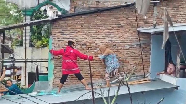 Kapolrestabes Medan Kombes Gidion Arif Setyawan mengevakuasi nenek di Gang Pelita 2, Jalan Brigjen Katamso, Kota Medan, yang terjebak banjir di rumahnya. Kombes Gidion harus naik ke atap untuk mengevakuasi nenek tersebut.