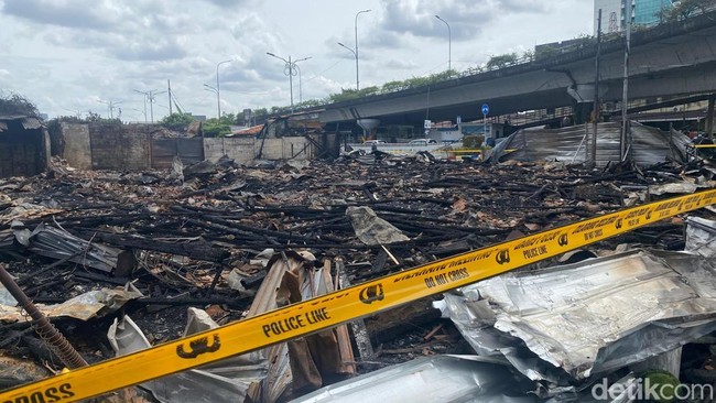 Kebakaran lapak barang bekas di Salemba, Jakarta Pusat (Jakpus), sudah padam. Garis polisi terbentang di lokasi.