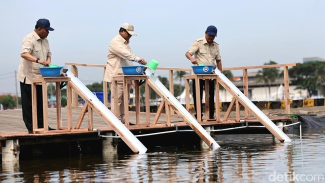 Prabowo kemudian ikut menebarkan benih ikan nila. Benih itu diharapkan dapat meningkatkan produktivitas tambak serta mendukung program prioritas KKP berbasis ekonomi biru.