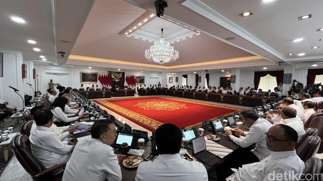 Pantauan detikcom, Senin (2/12/2024), sidang kabinet digelar di Kantor Presiden, Kompleks Istana Kepresidenan, Jakarta. Sejumlah menteri sudah mulai berdatangan pukul 14.30 WIB.