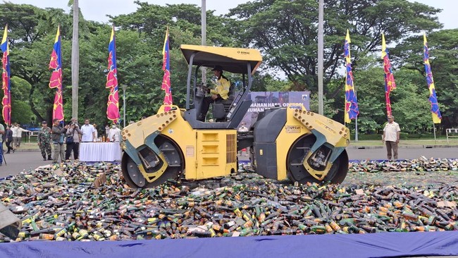 Kasatpol PP DKI Jakarta Satriadi Gunawan mengatakan, Petugas melakukan operasi razia miras ilegal di seluruh kota/kabupaten Jakarta. Berbagai merek disita dan kini dimusnahkan langsung di sisi tenggara Monas menggunakan alat berat compactor.