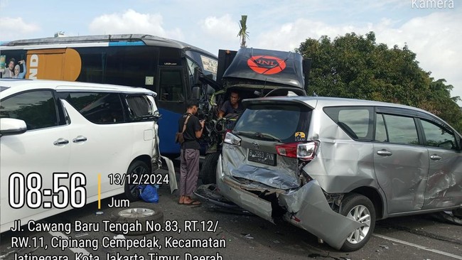 Tabrakan beruntun terjadi di Tol Dalam Kota arah Halim, Jakarta Timur (Jaktim). Sejumlah mobil rusak akibat kecelakaan itu.