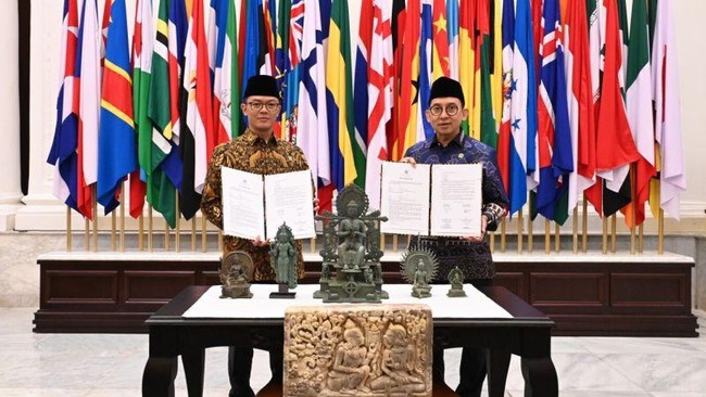 Menteri Luar Negeri RI Sugiono menyerahkan enam objek diduga cagar budaya (ODCB) yang bisa dipulangkan ke Tanah Air dari New York, Amerika Serikat (AS). enam ODCB itu diserahkan kepada Menteri Kebudayaan Fadli Zon.