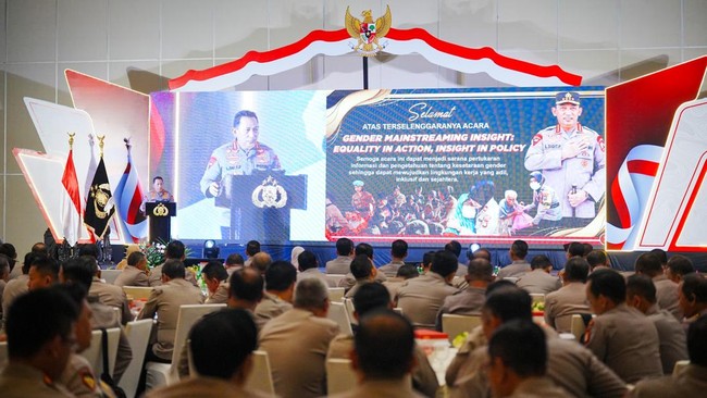 "Kemudian kalau kita lihat dari posisi Indonesia dalam mewujudkan kesetaraan gender, ini kita berada di peringkat 9 di Asia Timur dan Pasifik dan peringkat 87 dari 146 negara. Ini juga tadi malam saya tanyakan ke staf saya kok bisa ya kita di peringkat itu, kenapa enggak bisa lebih tinggi lagi, karena perjuangan kita sudah dari zaman dulu, dari zaman Ibu Raden Ajeng Kartini tapi kenapa posisi kita masih posisi seperti itu berarti masih banyak yang harus kita perjuangkan," ujar Kapolri.