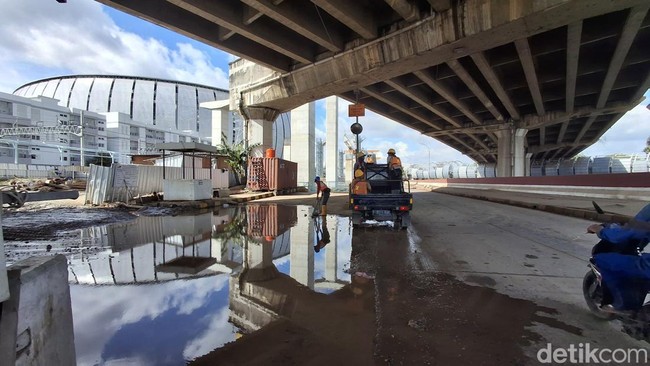 Maulana, petugas PPSU, kini sedang bersiaga di sekitar Jakarta International Stadium (JIS) dengan teman-temannya. Mereka ditugaskan untuk mengantisipasi jika air kembali meluap di sekitar JIS.