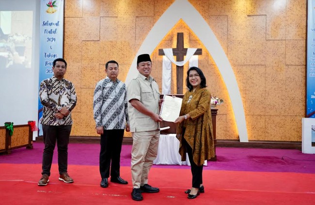 Di tengah suka cita suasana Natal, Menteri ATR/Kepala BPN, Nusron Wahid menyerahkan sertipikat GKP ini kepada Ketua Umum Majelis Sinode GKP, Magyolin Carolina Tuasuun.