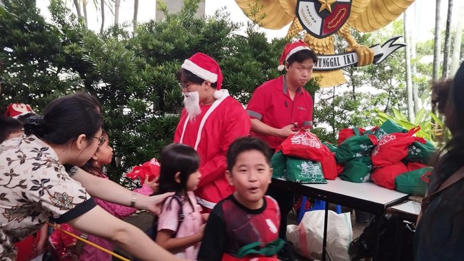 Terlihat seorang panitia yang mengenakan pakaian merah dan topi merah serta janggut putih seperti Santa membagikan bingkisan di dekat Plaza Maria, Gereja Katedral Jakarta. Anak-anak yang selesai menghadiri Misa Keluarga terlihat mengantre untuk mendapatkan bingkisan itu.