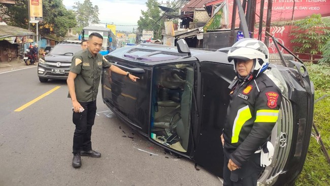 Kecelakaan lalu lintas terjadi Jalan Raya Puncak, Bogor, Jawa Barat. Satu unit mobil Toyota Fortuner terguling karena sopir diduga mengantuk.