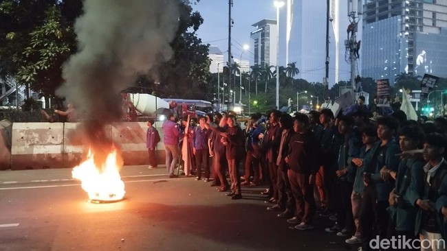 Namun massa aksi dari BEM SI memilih tetap bertahan di lokasi. Bahkan massa aksi membakar ban bekas di lokasi aksi.