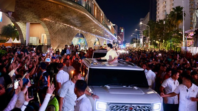 Presiden RI Prabowo Subianto disambut oleh antusias masyarakat yang berkumpul di sepanjang Jalan Sudirman-Thamrin, Jakarta Pusat. Prabowo melintas di lokasi setelah menghadiri Rapat Tutup Buku Tahunan bersama Menteri Keuangan Sri Mulyani dan mengumumkan PPN 12% hanya untuk barang mewah.