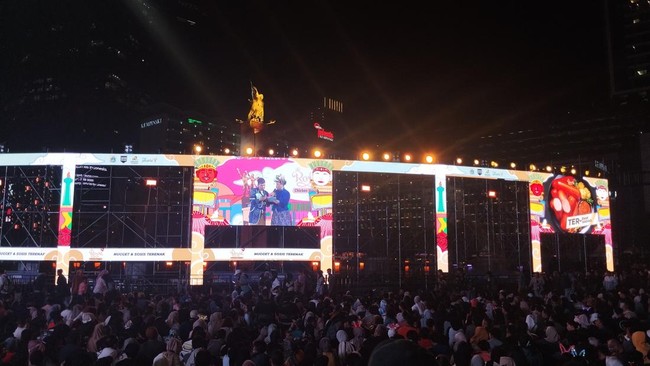 Warga yang berjarak cukup jauh dari panggung di Plaza Indonesia, melihat penampilan pertunjukan musik lewat layar LED yang terpasang di mengitari Bundaran HI.