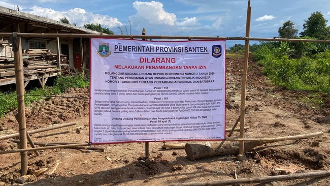 Dari pantauan di lokasi, gerbang area galian tambang dipasang spanduk penyegelan oleh Pemerintah Provinsi Banten. Penyegelan dilakukan pada Senin (6/1).