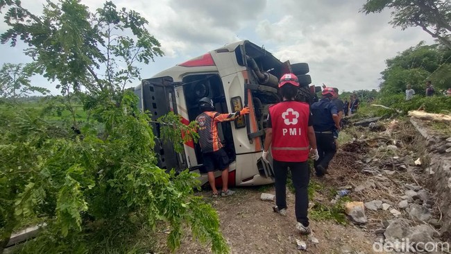 Dari pantauan detikJogja, bus ini masih berada di lokasi yang merupakan area persawahan. Kondisinya ringsek parah dan dalam keadaan terguling.