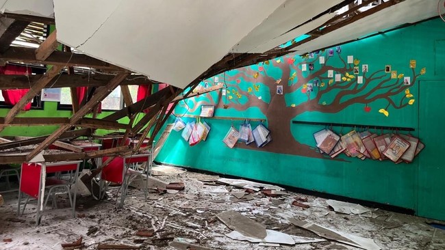 Atap dua ruang kelas di SD Negeri Mekarjaya Depok ambruk. Kepala SDN Mekarjaya 29 Depok, Rika Kartini, mengatakan warga setempat mendengar suara seperti gemuruh saat atap ambruk.