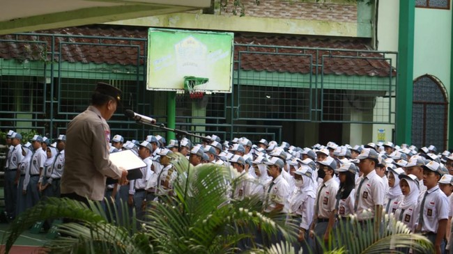 Personel Direktorat Pembinaan Masyarakat (Ditbinmas) Polda Metro Jaya menjadi inspektur upacara (irup) di sekolah. Polisi mengimbau agar para pelajar menjauhi narkoba hingga judi online.
