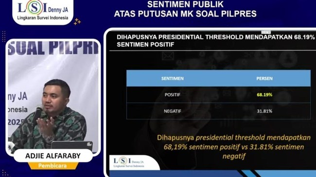 "Dari data itu, ini yang menarik, ternyata memang diputuskannya ambang batas pilpres nol persen atau tidak ada ambang batas oleh MK dalam putusan beberapa waktu lalu ini mendapat respons positif dari publik secara luas, ada 68,19 persen yang cenderung percakapannya positif atau sentimennya positif yang terjadi dalam riset kami," kata Adjie.