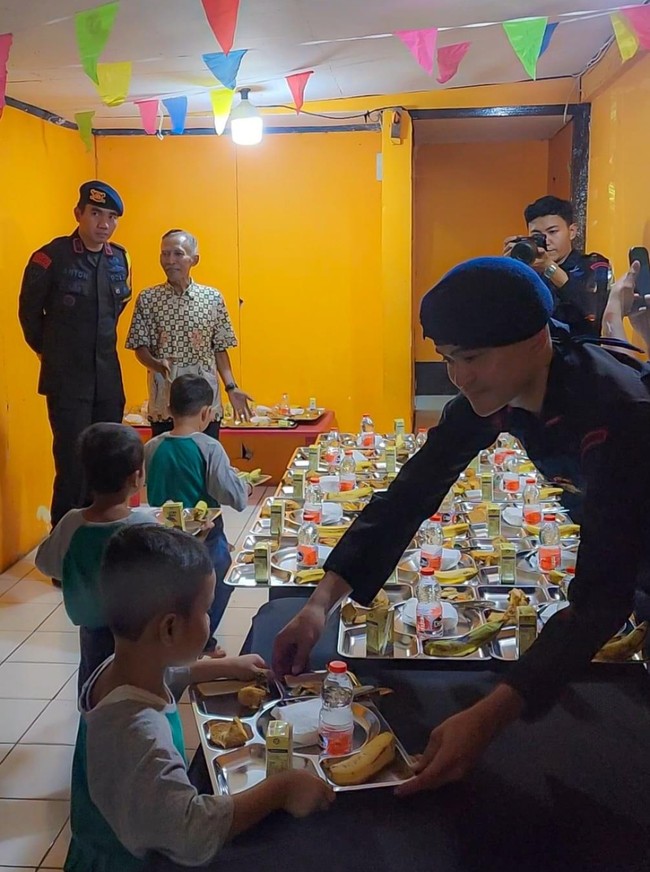 Satuan Brimob Polda Metro Jaya membagikan makan siang untuk para siswa di sekolah alternatif untuk anak jalanan (SAAJA), Kuningan, Jakarta Selatan. Kegiatan ini sebagai tindak lanjut Polri dalam mendukung program Makan Bergizi Gratis (MBG) Presiden RI Prabowo Subianto.