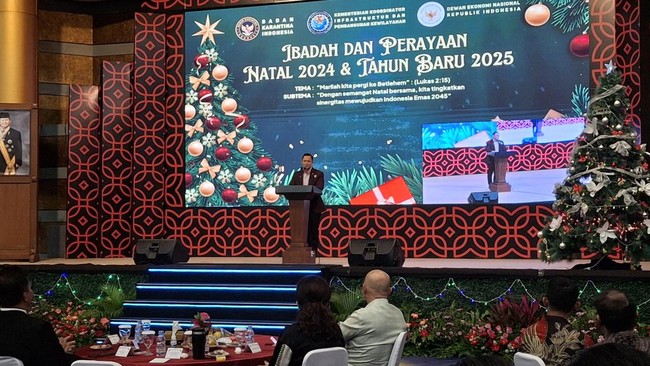 Menteri Koordinator (Menko) Infrastruktur dan Pembangunan Kewilayahan Agus Harimurti Yudhoyono (AHY) menghadiri perayaan Natal di Jakarta Pusat. Perayaan ini digelar bersama Badan Karantina Indonesia (Barantin) dan Dewan Ekonomi Nasional (DEN).