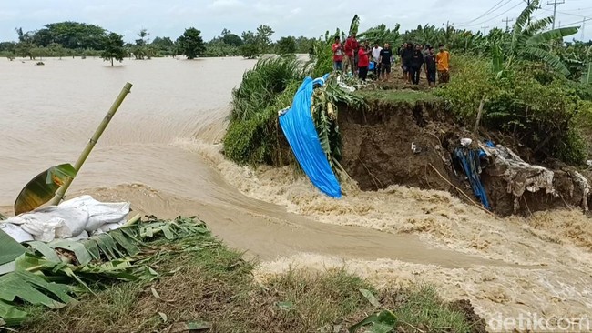 Pantauan di lokasi sekitar pukul 13.00 WIB tanggul jebol dekat jalan raya tersebut sekitar 7 meter. Air melaju kencang dari jebolan tanggul menutupi total jalan raya hingga ketinggian tiga meter.
