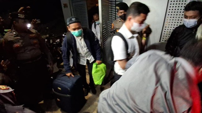 Para penyidik KPK menenteng koper masing-masing dua berwarna hitam serta satu koper warna biru dongker. Sedangkan tas jinjing yang dibawa berwarna hijau.