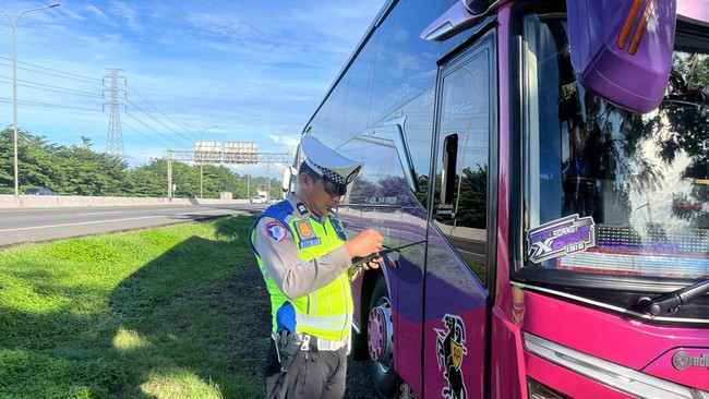 Polisi bersama dinas perhubungan (dishub) melakukan uji kelaikan kendaraan atau ramp check di rest area Tol Jagorawi Km 45, Bogor, Jawa Barat. Kendaraan yang dicek adalah yang hendak menuju ke Puncak, Bogor.