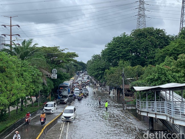 Kondisi banjir di jalan ini tak jauh berbeda dengan kondisi per pukul 12.08 WIB, tadi siang. Namun Bus TransJakarta, yang sebelumnya dialihkan, kini sudah melintasi jalan tersebut.